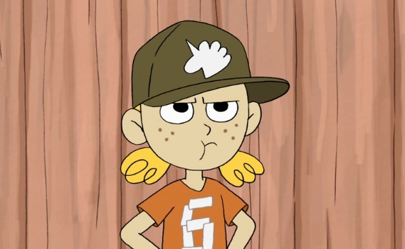 Dia mengenakan t-shirt dengan angka 6. Rambutnya pirang gelap dengan kuncir dan topi dan ikon unicorn.