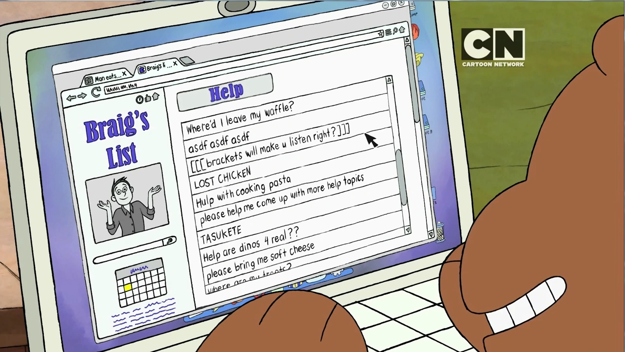 Dalam episode Grizz Helps, Grizzly mengunjungi situs Braig's List. Situs itu adalah parodi dari Craig's List dalam dunia asli. Alih-alih menampilkan iklan pekerjaan atau barang seperti versi aslinya, Braig's List juga menampilkan beberapa pertanyaan anonim seperti dalam situs Quora atau Yahoo! Answers.