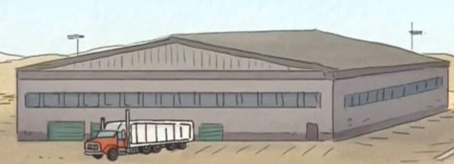 Bangunan itu sendiri sangat besar dan berbentuk persegi panjang, dengan banyak jendela di sepanjang dindingnya. Ada pintu hijau besar di satu sisi untuk mengirim paket dari pabrik ke truk pengiriman.