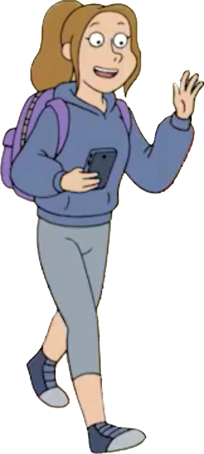 She has light skin, black eyes and eyeliner as well as long light brown hair tied in a ponytail. She wears a blue hoodie, gray pants, blue and gray shoes along with a purple backpack.