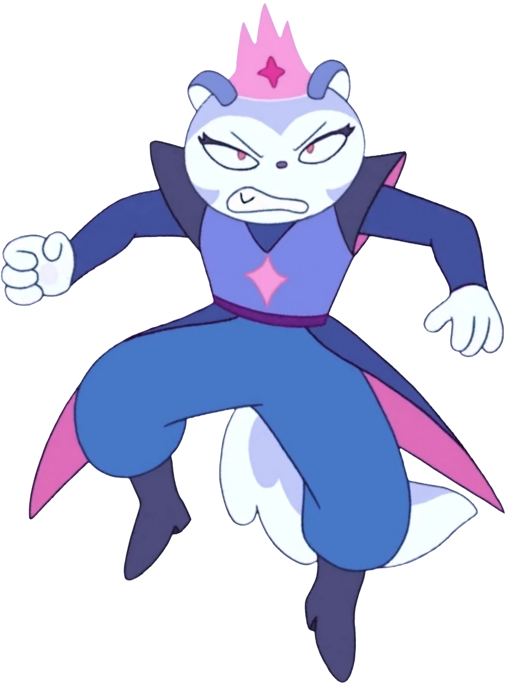 She wears a spacesuit in shades of blue with shoulder pads, dark blue boots and a pink four-pointed star symbol drawn on her chest.