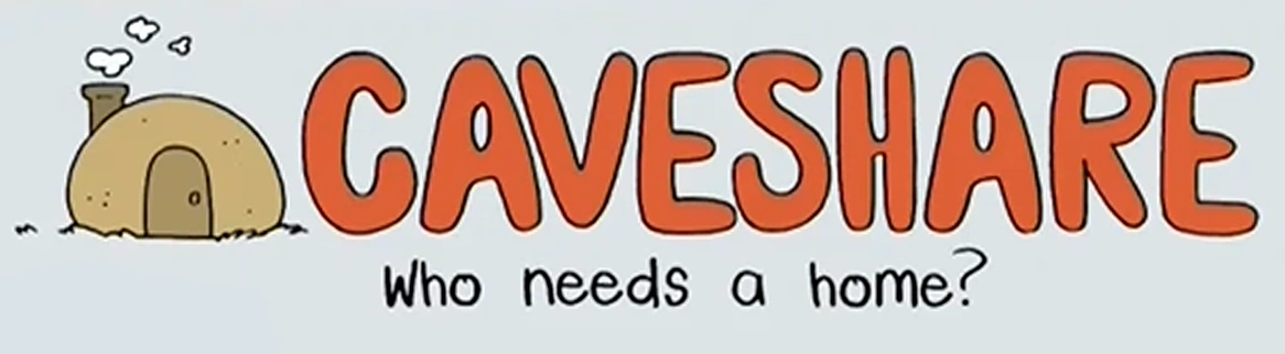 The logo is a small image of a rock-resembling cave with a door. It sits beside red text reading "CAVESHARE" with the site's catchphrase under the two reading, "Who needs a home?"
