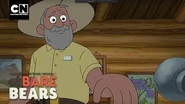 Meanwhile, Charlie is enjoying an evening walk through the woods when all of a sudden he smells something delicious. He soon finds one of the jars of snacks, not knowing about the traps Ranger Tabes set up to catch him. He gets caught, and the triggered flare alerts the bears and Tabes to his location. Everyone runs to his location, with Grizzly reaching him first. He begins to try to free Charlie, who still doesn't know what's going on. Meanwhile, Panda and Ice Bear are having trouble distracting Ranger Tabes, who drives her ranger car to the scene of the triggered trap in a single-minded pursuit. Ice Bear eventually decides to "help" with the map by using it to obstruct Ranger Tabes's vision as she's driving. The car hits a tree, with no damage save for a disturbed bird's nest.