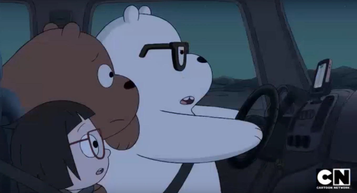 Chloe and the Bears are taking a road trip downtown to watch the meteor shower. Ice Bear wears glasses and is the only one who can drive because he's got a driver's license.